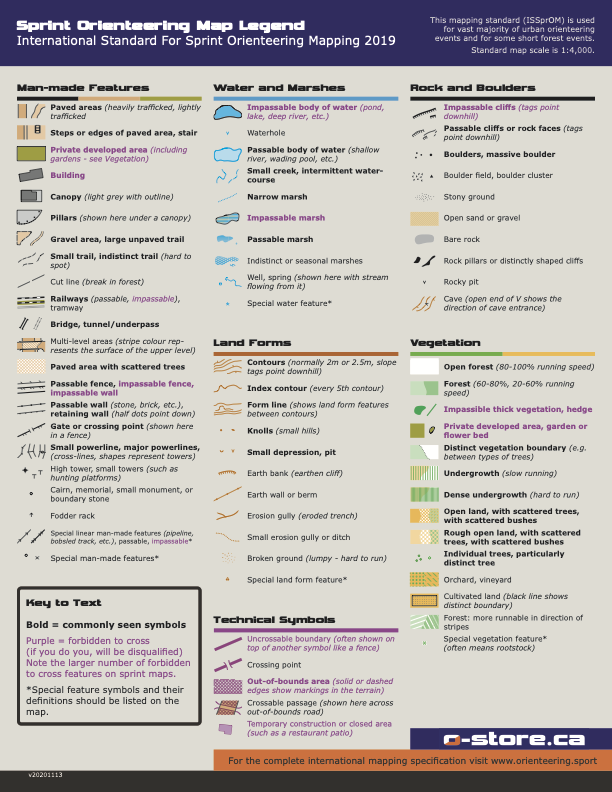 The Orienteering Map Legend and Sprint Orienteering Map Legend Reference Guides show you all the features you will find on an orienteering map and tells you how to interpret them.