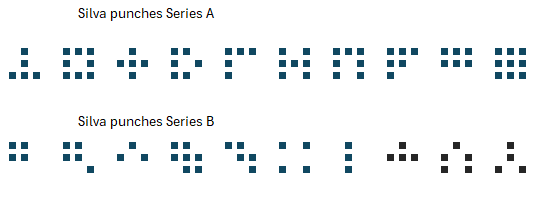 Silva punches are sold in set of 10. There are two pattern sets, series A and series B. Punches come with a cord to attach them to a flag, and also with holes in the base to permantly attach them to an orienteering control post.
